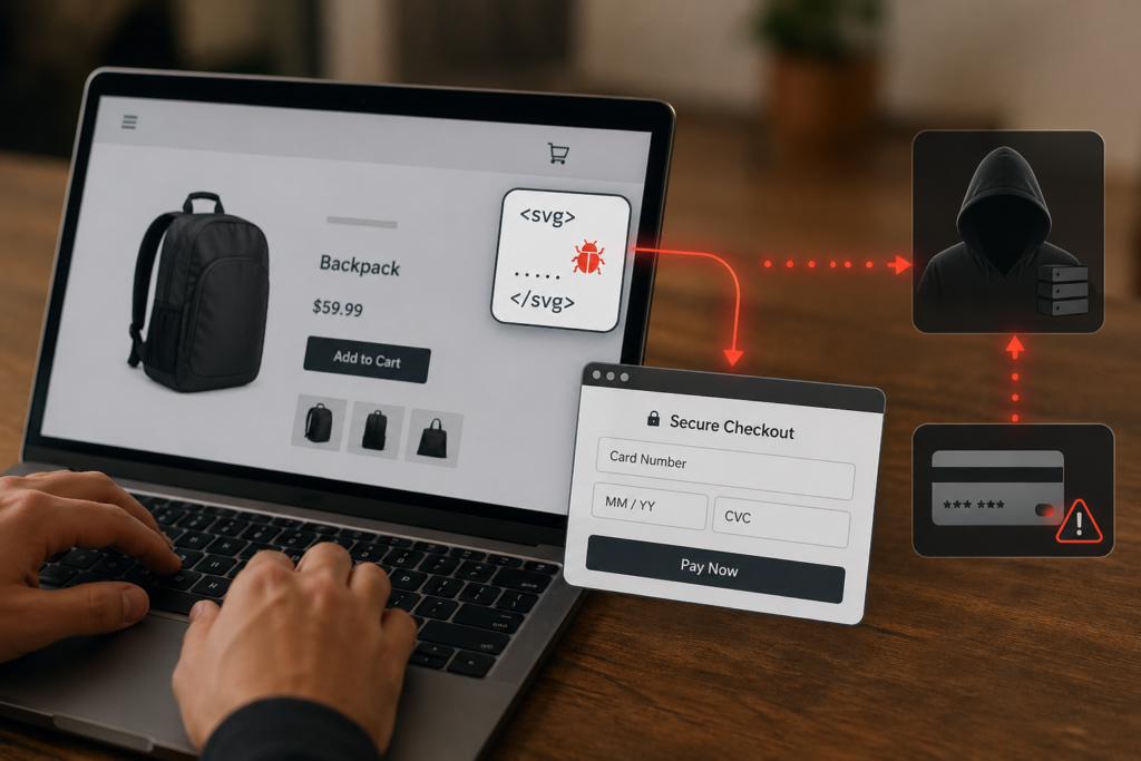 What makes this campaign especially dangerous is not just the skimming itself, but the blind spot it exploits. PCI DSS 4.0.1 Requirements 6.4.3 and 11.6.1 focus on the payment page, and many organizations have built their defenses around that same boundary. This campaign shows why that boundary was never enough. Instead of attacking the final checkout page, the attackers steal card data earlier in the customer journey, on product, cart, or other pre-checkout pages that many teams treat as lower risk. That creates a false sense of safety: the real checkout may still look intact, while sensitive data is captured before the customer ever reaches it. The unusual twist is the abuse of a tiny SVG image element, a standard browser feature repurposed to quietly launch malicious code and display a convincing fake checkout experience that looks legitimate to the shopper.