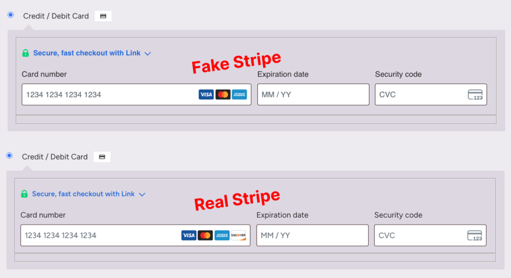 The Stripe fake is constructed by reading directly inside Stripe’s private sandboxed iframe — no visual replacement needed.