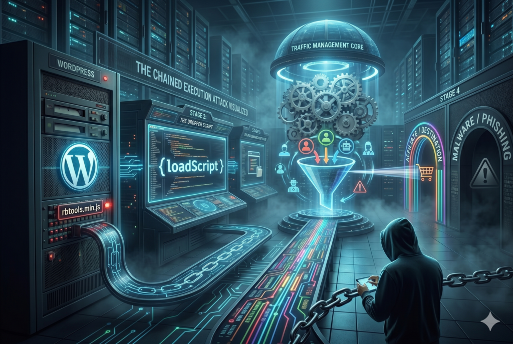 What makes this attack stand out is how little malicious code needs to live on the website itself. A small append to a legitimate JavaScript file was enough to turn a trusted WordPress asset into the first step of a controlled redirect operation, sending real visitors toward affiliate abuse, phishing, or malware while hiding the final destination from basic scanners. That is risky because the visible website may look normal, server-side logs may show very little, and the most harmful logic never has to sit on the compromised site at all. Instead, the attacker abused a trusted first-party script as a launcher for a Traffic Distribution System, or TDS, which is a remote decision engine that chooses where each visitor should be sent next.